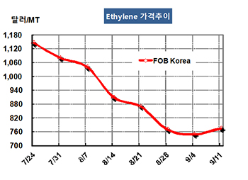 표, 그래프: < Ethylene 가격추이 > <화학저널 2015/09/14> |