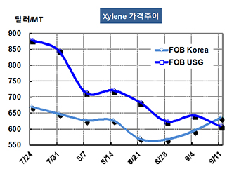 M-X(Mixed-Xylene) 시세는 500달러를 벗어나 600달러대 중반으로 도약했다. M-X 가격은 9월11일 Solvent 그레이드 FOB Korea 톤당 634달러로 40달러 급등했으나 CFR SE Asia는 672달러로 13달러 상승에 그쳤다. 표, 그래프: < Xylene 가격추이 > <화학저널 2015/09/17> |