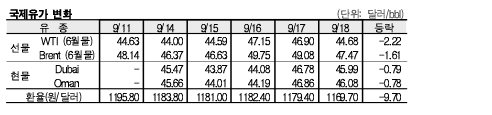 9월18일 국제유가는 미국 증시 약세 및 미국 달러화 강세, OPEC(석유수출국기구)의 시장 방어정책 지속 전망 등으로 하락했다.