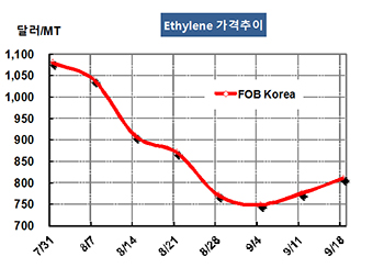 표, 그래프: < Ethylene 가격추이 > <화학저널 2015/09/21> |