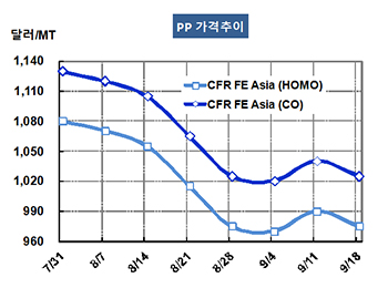 PP(Polypropylene) 시세는 동북아가 하락한 반면 동남아는 상승했다. PP 가격은 9월16일 Raffia 및 Injection 그레이드 기준 CFR FE Asia 톤당 975달러로 15달러 하락한 반면 CFR SE Asia는 1030달러로 25달러 급등했다. CFR S Asia 역시 1050달러로 20달러 상승했다. 표, 그래프: < [PP 가격추이 > <화학저널 2015/09/22> |