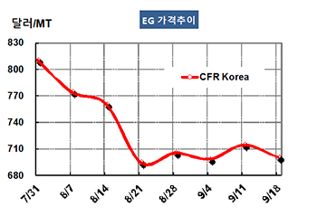 MEG(Monoethylene Glycol) 시세는 상승 1주일만에 하락세로 전환됐다. MEG 가격은 9월18일 CFR China 톤당 700달러로 14달러 하락했고 CFR SE Asia는 701달러를 형성했다. 표, 그래프: < EG 가격추이 > <화학저널 2015/09/22> |