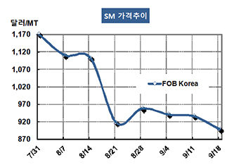 SM(Styrene Monomer) 시세는 정기보수에도 불구하고 900달러가 붕괴됐다. SM 가격은 9월18일 FOB Korea 톤당 898달러로 38달러 급락했고 CFR China는 919달러를 형성했다. 표, 그래프: < SM 가격추이 > <화학저널 2015/09/23> |