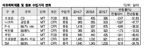 표, 그래프: < 석유화학제품 및 원료 수입가격 변화 > <화학저널 2015/09/23> |