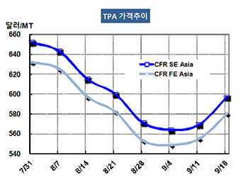 PTA(Purified Terephthalic Acid) 시세는 중국 플랜트 정기보수와 중국 국경절 영향으로 상승했다. PTA 판매자들은 가격이 상승세를 나타냈음에도 불구하고 대부분 FOB NE Asia 톤당 600달러 이상을 기대하고 있는 것으로 알려졌다. 표, 그래프: < TPA 가격추이 > <화학저널 2015/09/24> |