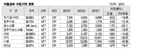 표, 그래프: < 비철금속 수입가격 변화 > <화학저널 2015/09/25> |