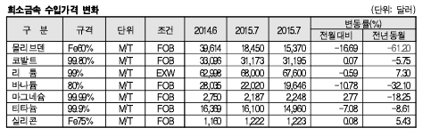표, 그래프: < 희소금속 수입가격 변화 > <화학저널 2015/09/25> |