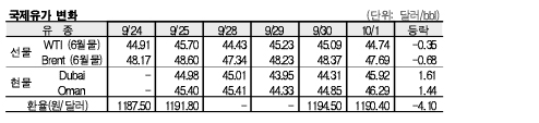 10월1일 국제유가는 허리케인의 미국 동부지역 상륙 가능성 약화 및 시리아 사태와 관련된 지정학적 리스크 감소, 중국 경기둔화 우려 등으로 하락했다.