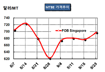 표, 그래프: < MTBE 가격추이 > <화학저널 2015/10/02> |
