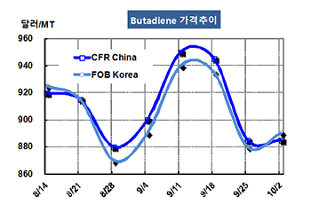 부타디엔(Butadiene)은 연속 하락에 대한 반발로 상승했다. 부타디엔 가격은 10월2일 FOB Korea 톤당 890달러로 10달러 상승했으나 CFR SE Asia는 840달러로 변동이 없었다. CFR SEA는 FOB Korea에 비해 톤당 50달러 낮아 CFR을 감안하면 80달러 낮은 수준을 형성한 것으로 분석되고 있다. 표, 그래프: < Butadiene 가격추이 > <화학저널 2015/10/06> |