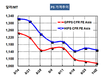 GP, CFR China 1075달러로 10달러 떨어져 … HIPS도 1150달러로