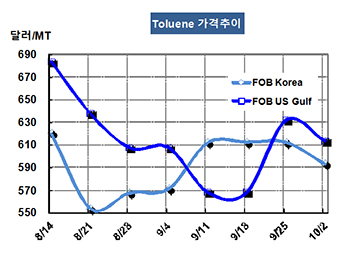 톨루엔(Toluene)은 오랜만에 하락세로 돌아섰다. 톨루엔 가격은 10월2일 FOB Korea 톤당 593달러로 20달러 하락했고 CFR China는 90일 신용거래 기준 639달러로 34달러 급락했다. 표, 그래프: < Toluene 가격추이 > <화학저널 2015/10/07> |