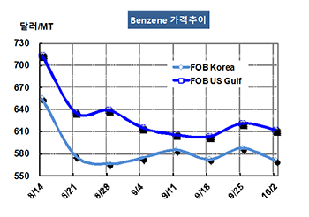 벤젠(Benzene)은 500달러대 후반에서 등락을 거듭하고 있다. 벤젠 가격은 10월2일 FOB Korea 톤당 571달러로 16달러 하락했고 FOB SE Asia는 561달러로 10달러 낮은 수준을 형성했다. 표, 그래프: < Benzene 가격추이 > <화학저널 2015/10/07> |