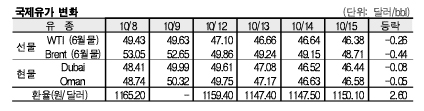 10월15일 국제유가는 미국의 원유 재고 증가 및 달러화 강세 등으로 하락했다.