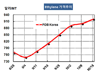 에틸렌(Ethylene)은 싱가폴 크래커의 가동중단으로 상승세를 지속했다. 에틸렌 가격은 10월16일 FOB Korea 톤당 920달러로 20달러 상승했고 CFR SE Asia도 920달러로 20달러 올랐다. 다만, CFR NE Asia는 940달러로 5달러 상승에 그쳤다. 표, 그래프: < Ethylene 가격추이 > <화학저널 2015/10/19> |