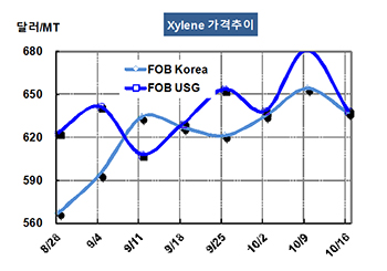 M-X(Mixed-Xylene) 시세는 시장침체가 계속돼 하락했다. CFR China도 670달러로 17달러 하락했으나 중국 동부지역의 M-X 재고가 7만톤으로 1.8% 감소해 시장에 영향을 미치지 못했다. 표, 그래프: < Xylene 가격추이 > <화학저널 2015/10/22> |