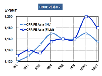 HDPE(High-Density Polyethylene)는 전체적으로 하락세가 뚜렷해지고 있다. HDPE 가격은 10월21일 Injection 그레이드 기준 CFR FE Asia 톤당 1155달러로 15달러 하락했고 CFR SE Asia도 1175달러로 15달러 떨어졌다. CFR S Asia는 1195달러로 15달러 하락했다. 표, 그래프: < HDPE 가격추이 > <화학저널 2015/10/26> |