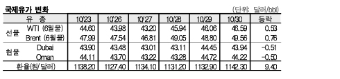 10월30일 국제유가는 미국 원유 시추리그 수 감소 및 OPEC(석유수출국기구) 생산량 감소 추정, 미국 달러화 약세 등으로 하락했다.