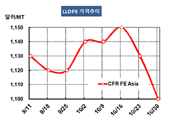 LLDPE(Linear Low-Density Polyethylene) 시세는 하락세가 가속화되고 있다. LLDPE 가격은 10월28일 CFR FE Asia 톤당 1100달러로 30달러 급락했고 CFR SE Asia는 1220달러로 역시 30달러 떨어졌다. 표, 그래프: < LLDPE 가격추이 > <화학저널 2015/11/02> |
