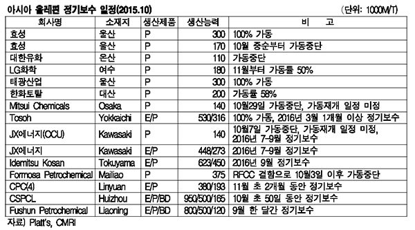표, 그래프: < 아시아 올레핀 정기보수 일정(2015.10) > <화학저널 2015/11/09> |