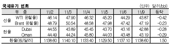 11월9일 국제유가는 미국 쿠싱지역 원유 재고 증가 추정 및 중국 원유 수입 감소, 주요국 증시 약세 등으로 하락했다.
