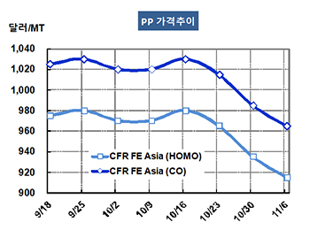 PP(Polypropylene)는 수요 부진으로 하락세를 지속하고 있다. PP 가격은 11월4일 Raffia 그레이드 기준 CFR FE Asia 톤당 915달러로 20달러 하락했고 CFR SE Asia는 980달러로 10달러 떨어졌다. Injection 그레이드는 CFR FEA가 910달러, CFR SEA는 980달러로 각각 10달러 하락했다. 표, 그래프: < PP 가격추이 > <화학저널 2015/11/10> |