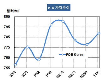 표, 그래프: < P-X 가격추이 > <화학저널 2015/11/12> |