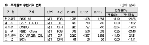 표, 그래프: < 유․무기원료 수입가격 변화 > <화학저널 2015/11/17> |
