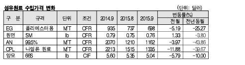 표, 그래프: < 섬유원료 수입가격 변화 > <화학저널 2015/11/17> |