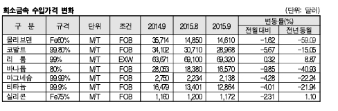 표, 그래프: < 희소금속 수입가격 변화 > <화학저널 2015/11/19> |