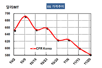 표, 그래프: < EG 가격추이 > <화학저널 2015/11/24> |
