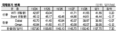 12월1일 국제유가는 브렌트유(Brent)가 OPEC(석유수출국기구) 공급과잉 기조 유지 전망으로 하락한 반면, WTI(서부텍사스 경질유)는 미국의 원유 재고 감소 전망 등으로 상승했다.