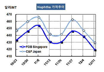 나프타(Naphtha)는 400달러대 초반으로 밀려났다. 나프타 가격은 12월11일 CFR Japan 톤당 429달러로 18달러 하락했고 FOB Singapore은 419달러로 19달러 떨어졌다. 표, 그래프: < Naphtha 가격추이 > <화학저널 2015/12/14> |