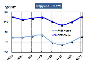 프로필렌(Propylene)은 좀처럼 상승세를 회복하지 못하고 있다. 프로필렌 가격은 12월11일 FOB Korea 톤당 581달러로 10달러 상승했고 CFR SE Asia는 650달러로 변동이 없었다. CFR China도 620달러로 10달러 올랐다. 표, 그래프: < Propylene 가격추이> <화학저널 2015/12/15> |
