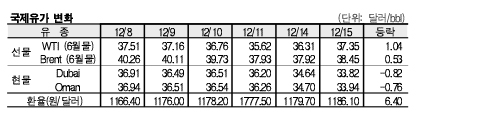 12월15일 국제유가는 선물시장 매수세 유입 및 미국 원유 재고 감소 전망 등으로 상승했다.