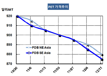 표, 그래프: < PET 가격추이 > <화학저널 2015/12/17> |