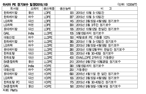 표, 그래프: < 아시아 PE 정기보수 일정(2015.10) > <화학저널 2015/12/21> |