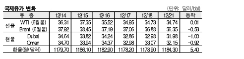 12월21일 국제유가는 이란 공급 확대 전망 및 사우디 원유 수출 증가 소식, 미국의 원유 생산 감소세 둔화 전망 등으로 하락했다.
