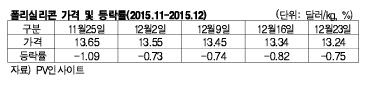 표, 그래프: < 폴리실리콘 가격 및 등락률(2015.11-2015.12) > <화학저널 2015/12/24> |