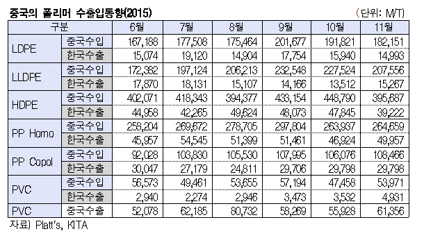 중국 수입량은 9월 5만7194톤에서 10월 4만7458톤으로 감소했다가 11월 5만3971톤으로 다시 증가했고 한국산도 10월 3532톤에서 11월 4931톤으로 대략 1400톤 가량 증가했으며 중국의 PVC 수출량도 10월 5만5928톤에서 11월 6만1356톤으로 늘어났다.
