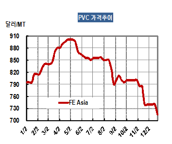 PVC(Polyvinyl Chloride)는 원료 에틸렌(Ethylene)을 따라 2015년 상반기에 강세를 나타냈으나 하반기 이후 하락세를 지속했다. 표, 그래프 : < PVC 가격추이 > <화학저널 2016/01/05> |