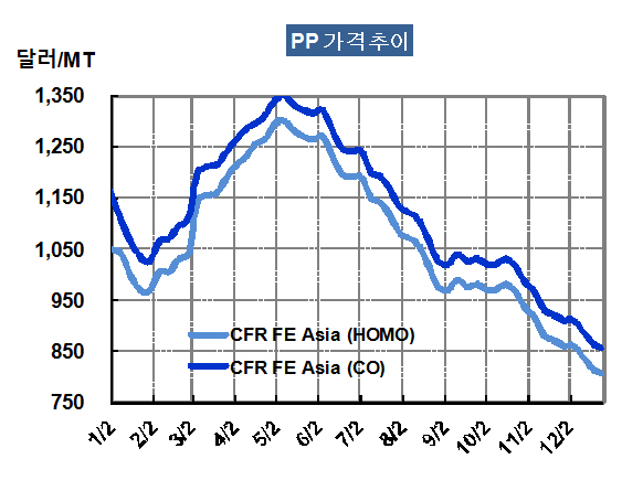 PP는 2015년 프로필렌 폭락으로 수익성을 유지했다. 표, 그래프: < PP 가격추이 > <화학저널 2016/01/05> |