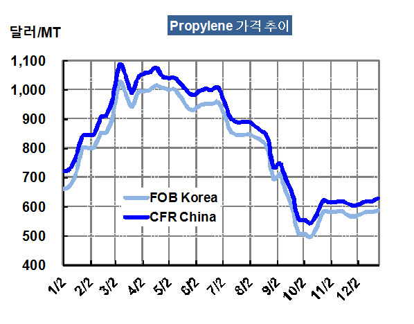 프로필렌은 2015년 하반기 이후 공급과잉으로 겉잡을 수 없는 폭락세를 기록했다. 표, 그래프: < Propylene 가격추이 > <화학저널 2016/01/05> |
