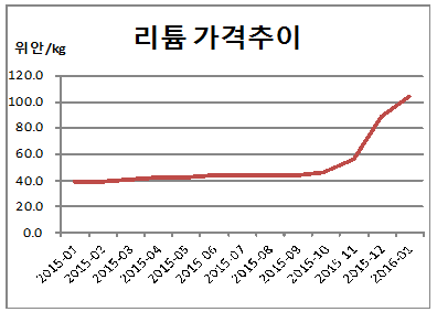 삼성SDI와 LG화학은 리튬(Lithium) 고갈 우려에도 불구하고 대책을 마련하지 못하고 있다. 표, 그래프 : <리튬 가격추이> <화학저널 2016/01/14> |