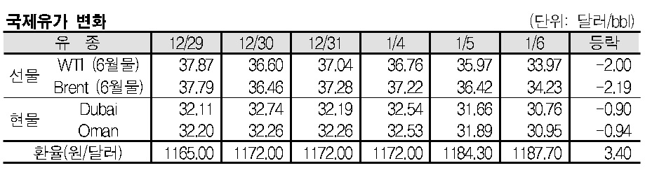 1월6일 국제유가는 미국의 원유 재고 증가 및 중국 경기지표 악화 등으로 하락했다.