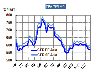 PTA(Purified Terephthalic Acid)는 수요부진 및 공급과잉이 장기화되는 동시에 원료 P-X(Para-Xylene) 강세로 수익성이 극심하게 악화됐다. 표, 그래프 : < TPA 가겨추이 > <화학저널 2016/01/07> |