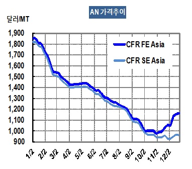 AN(Acrylonitrile) 시장은 2015년 만성적인 수요 부진을 배경으로 폭락행진을 지속하며 12월25일 CFR FE Asia 톤당 1160달러로 마무리했다. 표, 그래프: < AN 가격추이 > <화학저널 2016/01/08> |