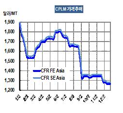 CPL 가격은 2015년 전체적으로 하락세를 이어감에 따라 카프로의 생존이 위협받고 있다. 표, 그래프: < CPLM 가격추이 > <화학저널 2016/01/08> |