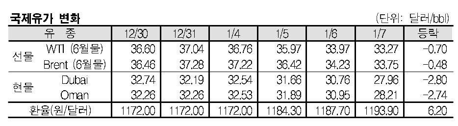 1월7일 국제유가는 중국 증시 폭락 등으로 하락했다. 1월7일 국제유가는 중국 증시 폭락 등으로 하락했다. 표, 그래프: <국제유가 동향> <화학저널 2016/01/08> |