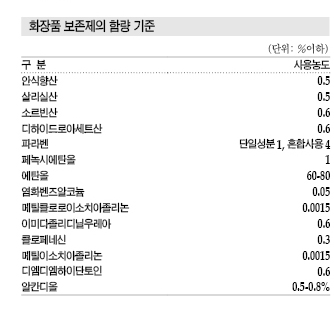 식품의약품안전처는 화장품에 사용되는 모든 화학 보존제에 대해 배합 한도를 지정해 관리하고 있다.